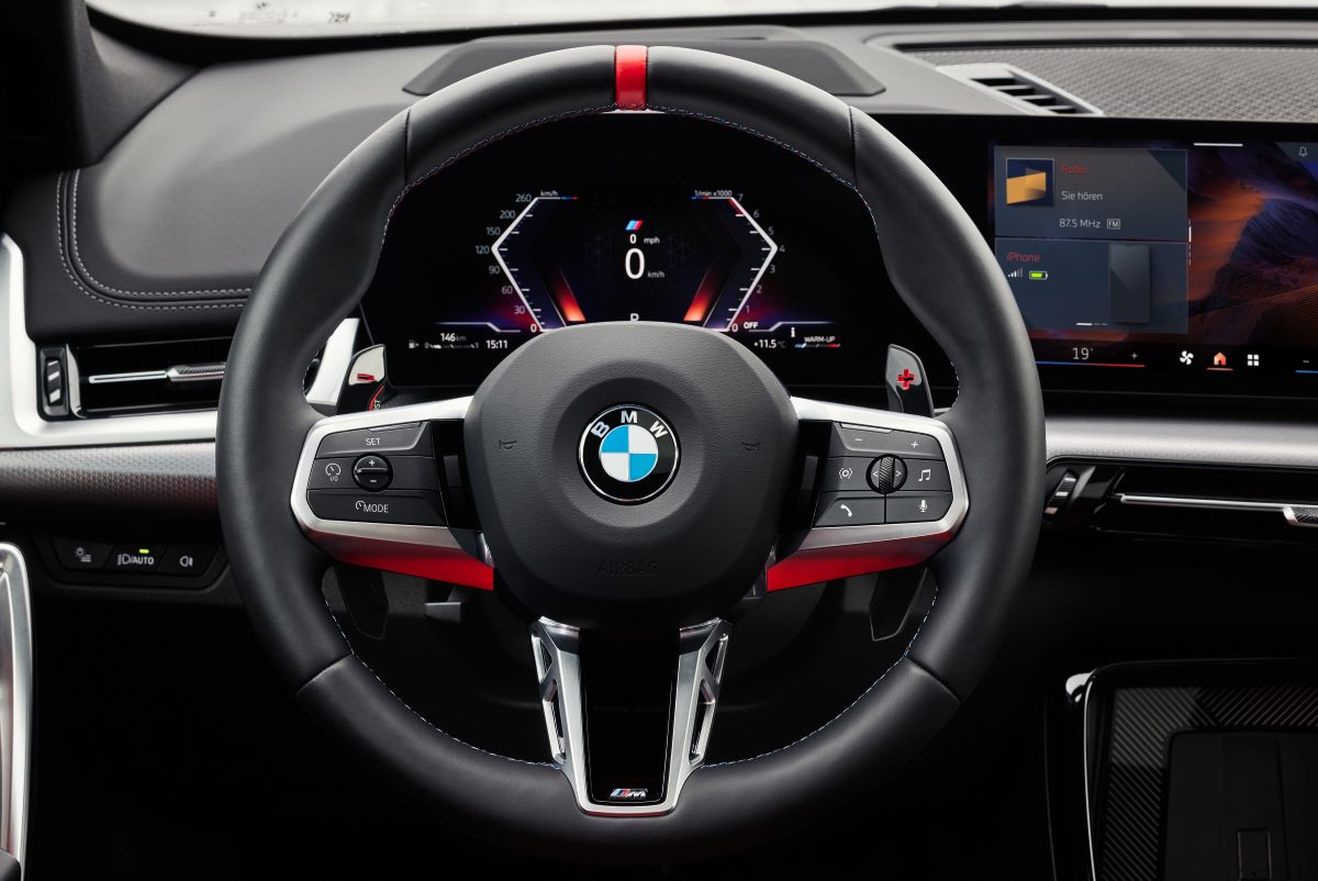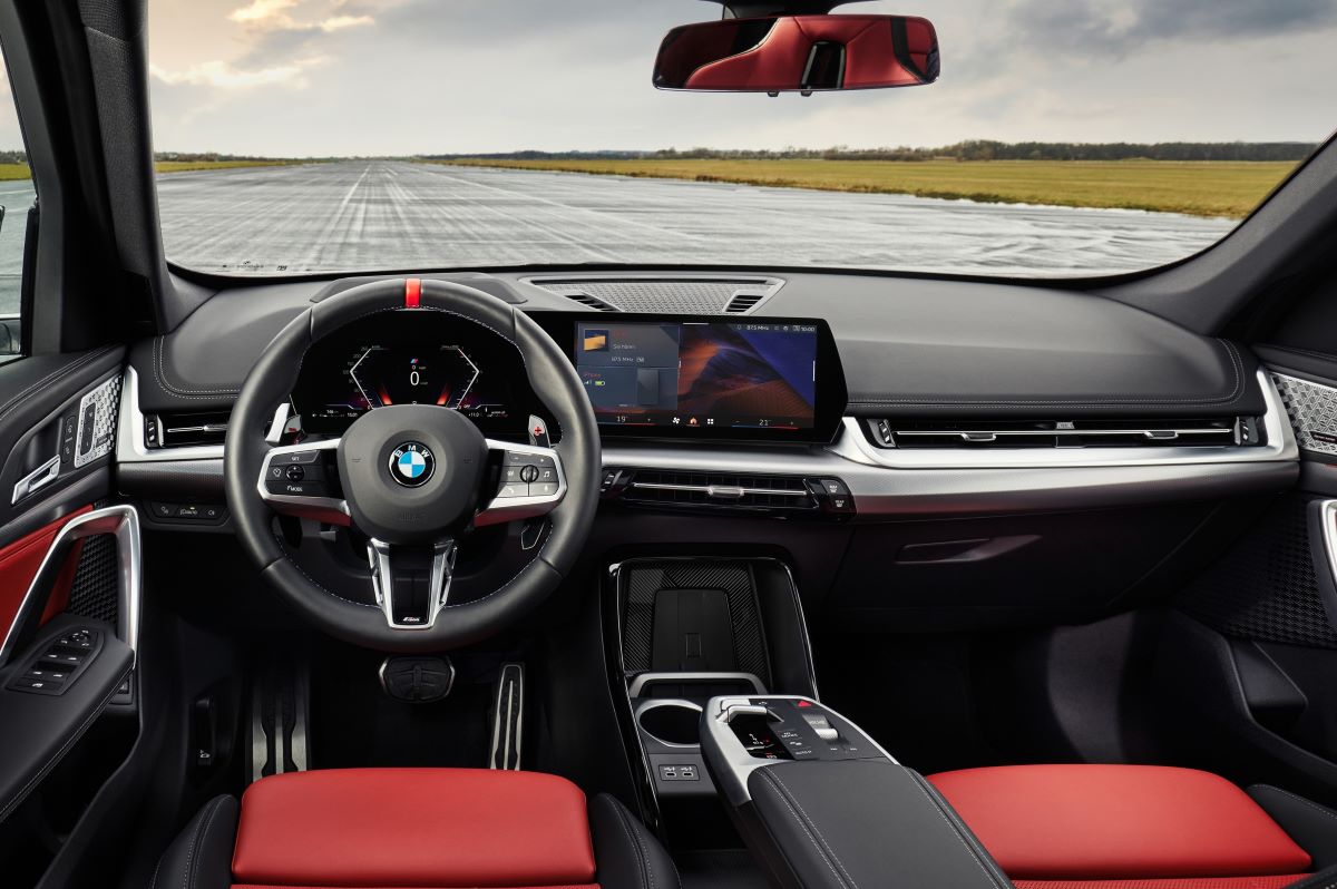 Kavisli geniş ekranlı mimari artık hayatımızın bir parçası. Sürücü ekranı 10,25 inç büyüklüğünde. Ayrıca 10,70 inç büyüklüğünde merkezi ekran söz konusu. Zaten bu X1 donanımı. Yani M’e özel bir durum değil. Ancak direksiyon M detayları ile harika. Diğer yandan elcikler de sürüş keyfini destekliyor. M spor koltuklar da görüntüsü ile büyülüyor. Elbette sürüş anında vücudu güzelce sarmalıyor. Yine yeni dünyanın gerçeği olarak vites konsolunda bir vites kolu yok. Vites seçici sayesinde daha ferah ve işlevsel bir mimari söz konusu.