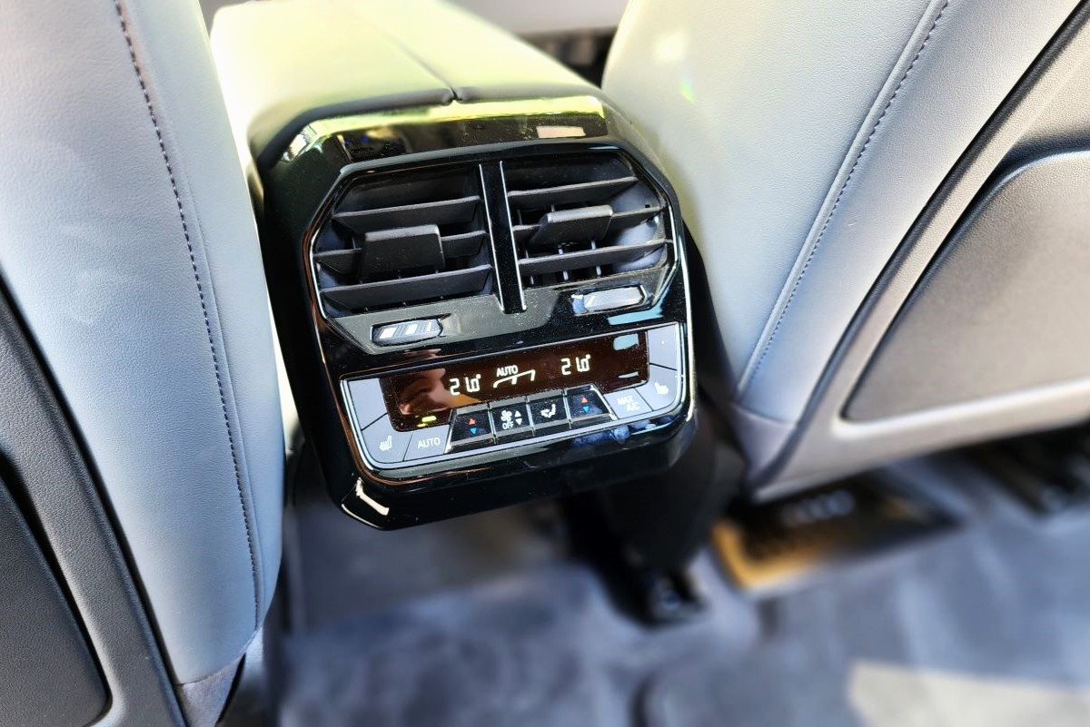 Arkası makam aracı seviyesinde. Ortada havalandırma ızgaraları. Aynı panelde arka koltuklar için bağımsız çift bölge iklimlendirme paneli. Ayrıca yandaki koltuklar için koltuk ısıtma. B sütunlarında ayrıca havalandırma ızgaraları yer alıyor. Kapı cepleri oldukça geniş. Şişe için ayrı bir göz yer alıyor. Dahası da var. Entegre koltuk başlıklarının arkasında ikişer adet Type-C USB girişi var. Yine burada BMW aksesuarlarını takmak üzere küçük bir kapak yer alıyor. Tüm bunlar parlak siyah bir panelde bir araya geliyor. Ortadaki boşluk ise ferahlık algısına katkı sağlıyor.