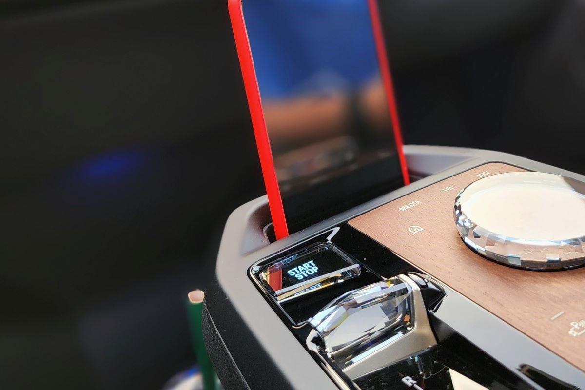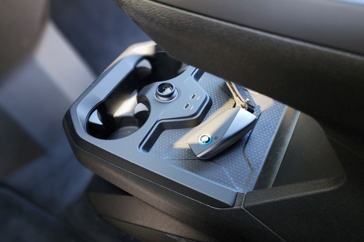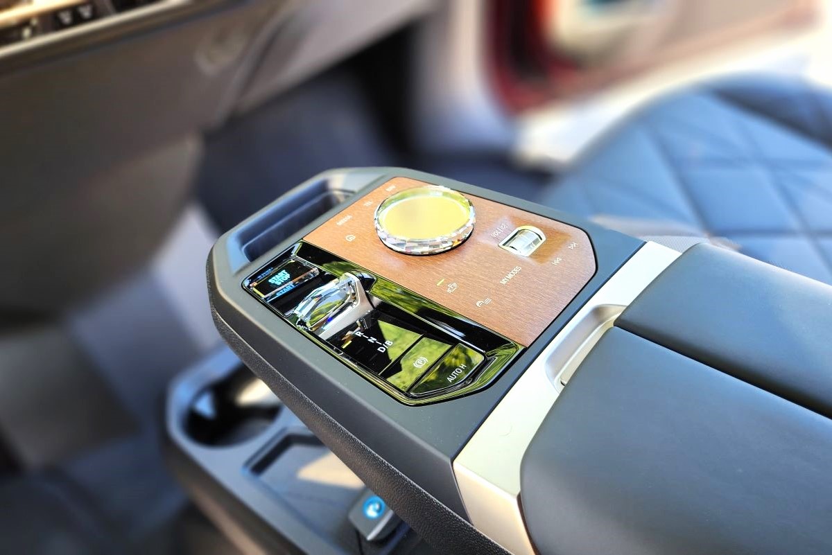 Vites konsolu daha geride. Havada asılı gibi duruyor. Altı boş ve hemen altında bardak tutucuyla ayrı bir göz yer alıyor. Burada iki adet bardaklık yer alıyor. Vites konsolunun konumu nedeniyle bu bardaklığı kullanmak kolay sayılmaz. Pek de ergonomik değil. Yine burada iki adet Type-C USB girişi yer alıyor. Ayrıca burada kablosuz şarj yuvası da yer alıyor. Vites konsolunun en ucunda telefon tutucu var. Hemen arkasında sağda süslü bir iDrive kumandası. Joystick vites de tarih oldu. Şık bir vites seçicimiz var artık. Daha geride alışkın olduğumuz haliyle iki kanatlı kolçak ve altında derin bir depolama alanı.