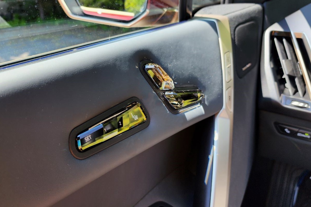 Alışılmış kalıpları kırıyor dedim ya. İşte araçtan inerken de yeni bir yaklaşımla yüzleşiyor kullanıcı. Alışagelmiş kapı mandalı yerine kapı düğmeyle açılıyor. İlk seferde ‘bu ne böyle’ diyor insan. Ancak birkaç açma hareketinin ardından çok da kullanışlı olduğunu fark ettim. Şık detayla her yerde göze çarpıyor. iDrive ile vites seçiciden bahsettim. Yine start düğmesi de kristal-cam bir malzemeden üretiliyor. Aynı malzeme koltuk ayarı ve hafıza panelinde de karşımıza çıkıyor. Ayrıca bunlar koltuk kenarında değil, kapı panelinde yer alıyor.