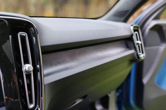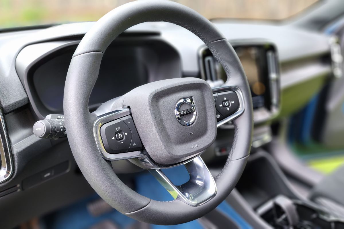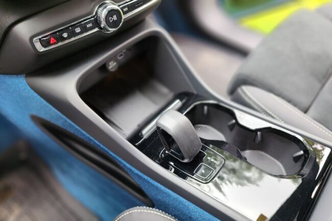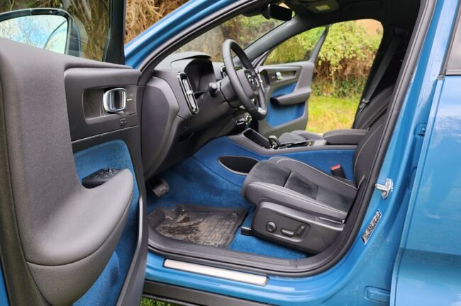 Kokpit tasarımı XC40 ile aynı. Dolayısıyla güncel Volvo kokpit tasarımını yansıtıyor. Karmaşadan uzak ve yalın. Az düğmeli daha ekran odaklı bir konsol söz konusu. Ayrıca abartılı veya havalı değil. Konsol geneline gri ve siyah hakim. Az sayıda parlak yüzey ile hareket kazanıyor konsol. Kabin içindeki belki de canlı unsur zemin halısı. Mavi rengi ile dış gövde rengiyle uyum sağlıyor. Dahası iç mekana hareket getiriyor ve ferahlık katıyor.